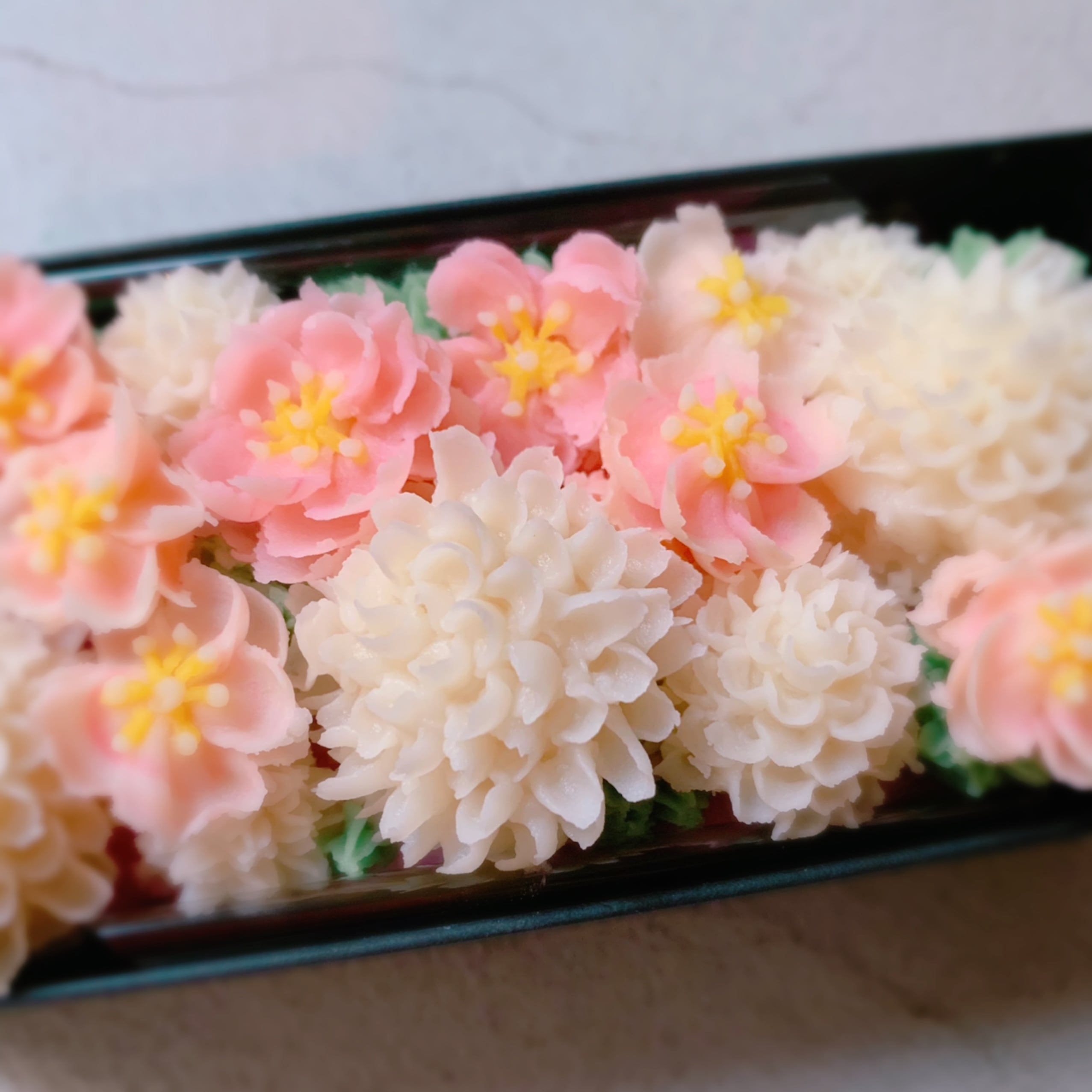 抹茶とプレーン味の二層のパウンド型のケーキの上に、ピンクのあん、ピンクの桃の花、白いピンポンマムのお花をデコレーションしました。