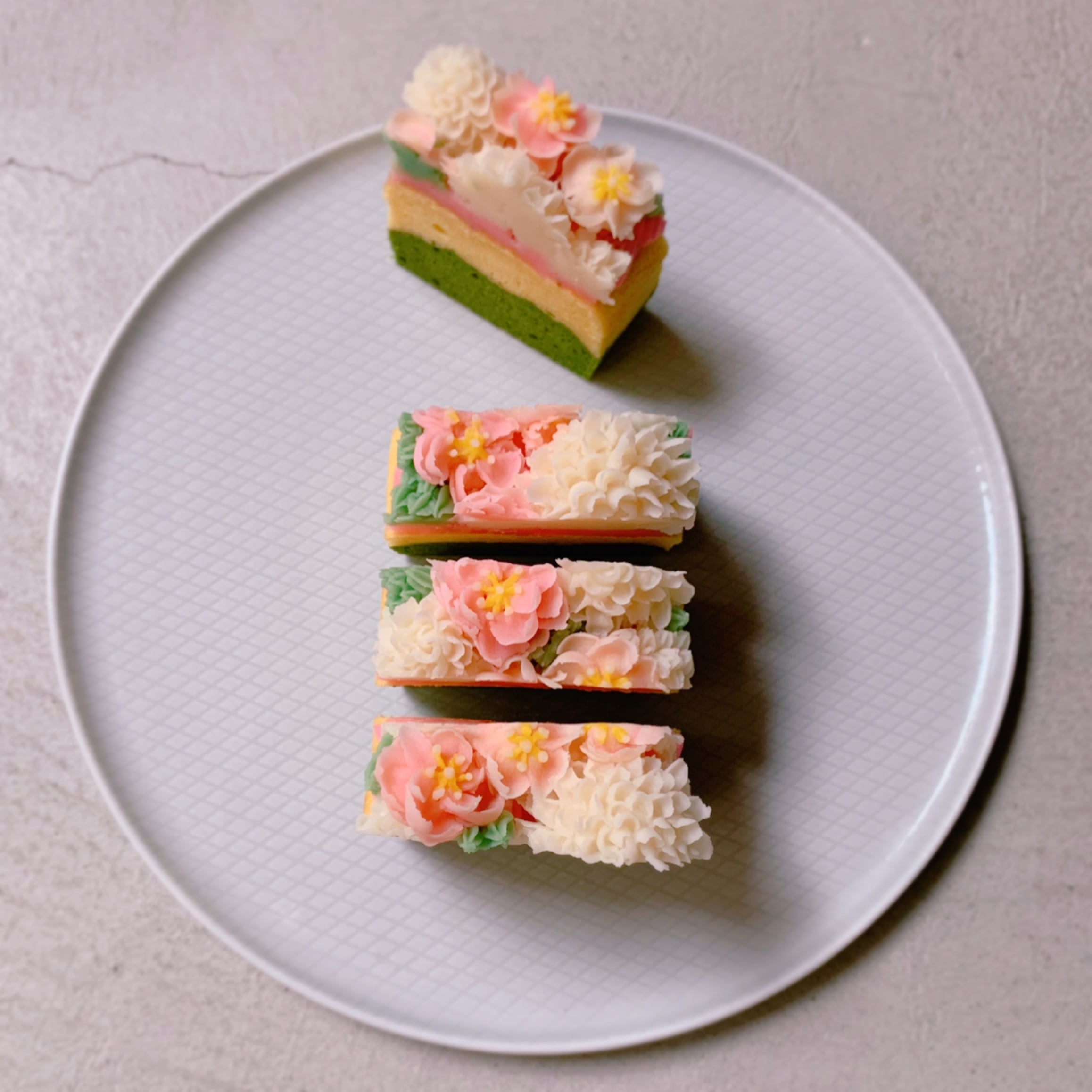 ケーキをカットすると、緑、白、ピンクの断面が菱餅のカラーリングになります。